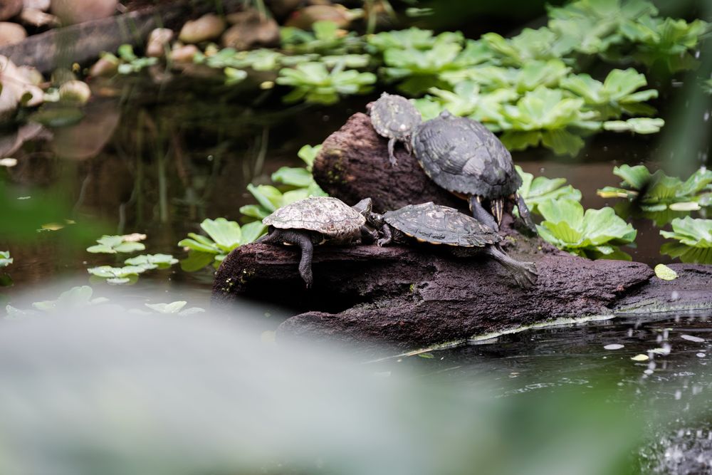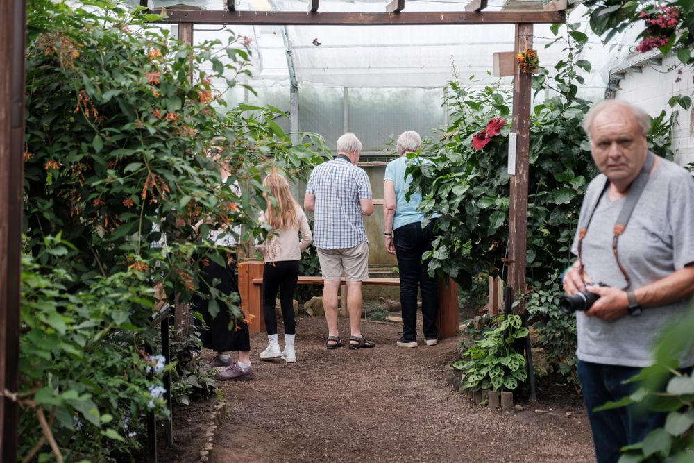 Dank des tropischen Klimas im Gewächshaus leben dort auch etliche chinesische Zwergwachteln, Chamäleons, Schildkröten, verschiedene Vogelarten und ein Bienenvolk (unter einem Glaskasten). Bunte Blumen und eine idyllische Atmosphäre laden in unserem Garten zum Träumen ein.