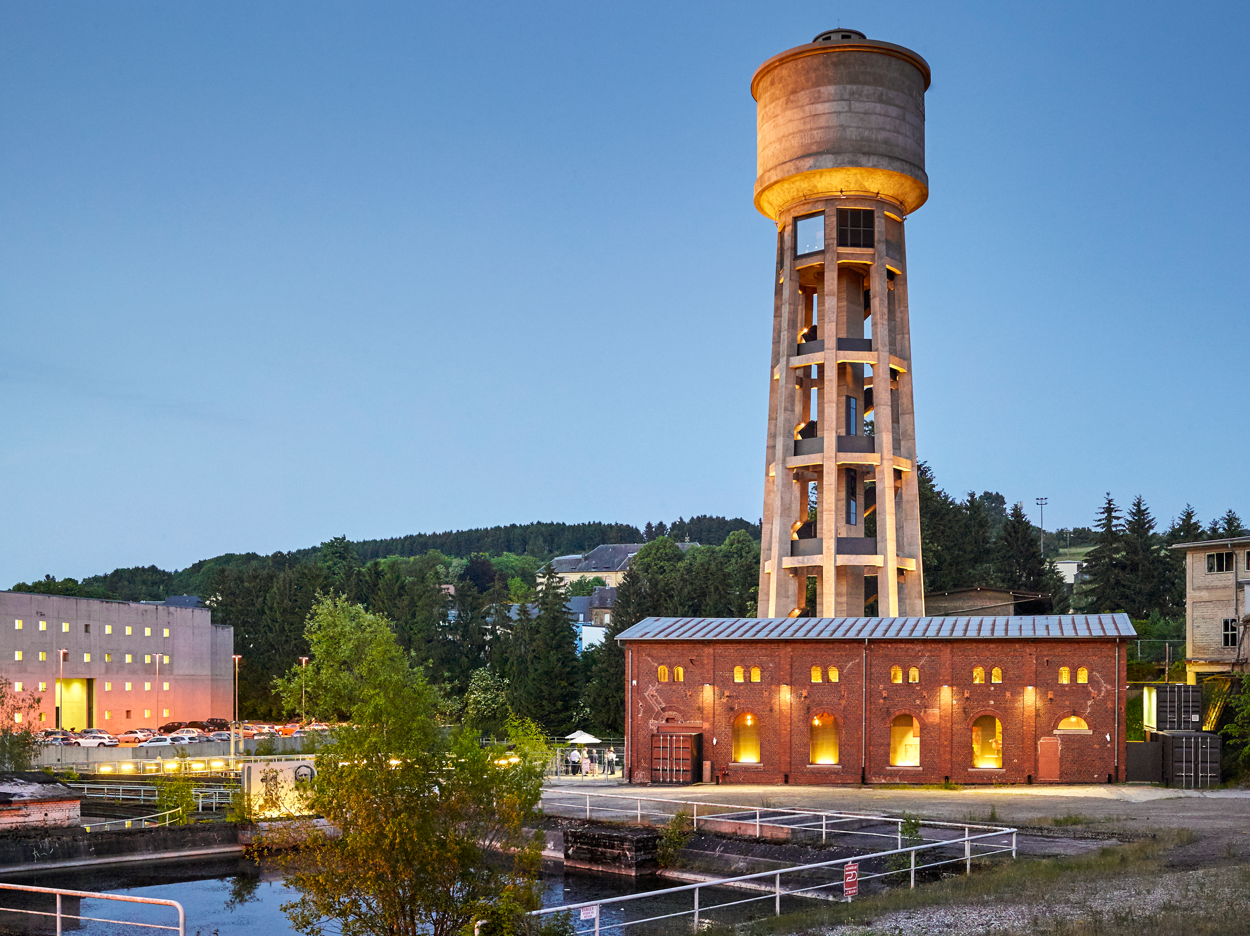 Im Inneren des Wasserturms (Waassertuerm) verbergen sich zwei Ausstellungsräumen im Sockel und im ehemaligen Wasserbehälter des Turms, die temporäre Ausstellungen beherbergen. Der Zugang zum ehemaligen Wasserspeicher des Turms über die Aussichtsgalerie gewährt dem Besucher einen beeindruckenden Panoramablick über den Standort am Rande des früheren Walzwerkes, die Stadt Düdelingen und die Landschaft jenseits der Grenze. Der Aufstieg erlaubt dem Besucher zudem sich zu sammeln und etwas Distanz zum ersten Teil der Ausstellung zu gewinnen, bevor er wieder in die Atmosphäre der Ausstellung im Wassertank eintaucht. Abschließend führt der nicht weniger eindrucksvolle Abstieg über die hexagonale Außentreppe hinunter zur Aussichtsterrasse und dem “Waldgarten” am Sockel des Turms. Gleich nebenan befindet sich das ehemalige Pumpwerk (Pomhouse), das nach seiner Umwandlung heute fungiert als Veranstaltungsort sowie eine Plattform für Diskussion und Begegnungen.