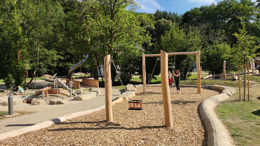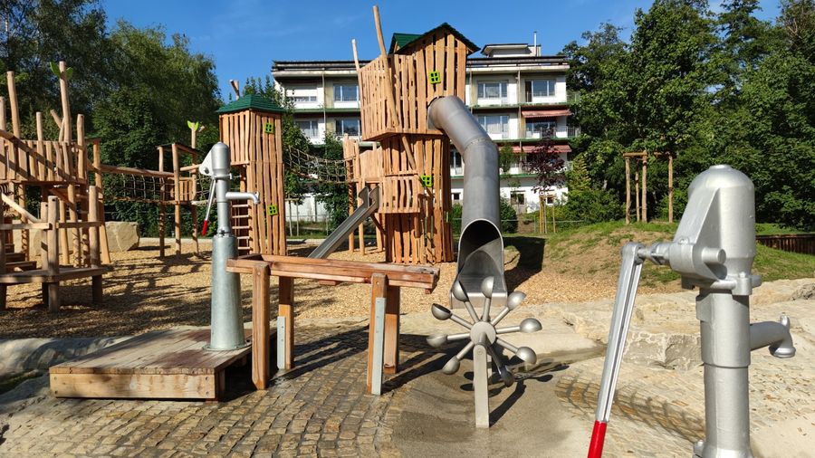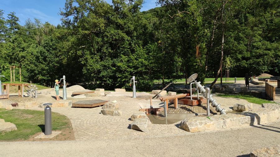 Der groe Erlebnis-Spielplatz verfügt über unterschiedliche Bereiche: Schaukeln im Eingangsbereich, ein barrierefrei gestaltetes Karussell und ein Wasserspielplatz. Wasser kann durch Pumpen mit der eigenen Muskelkraft bewegt werden, es gibt Mini-Staudämme, Kurbeln und Wippen.