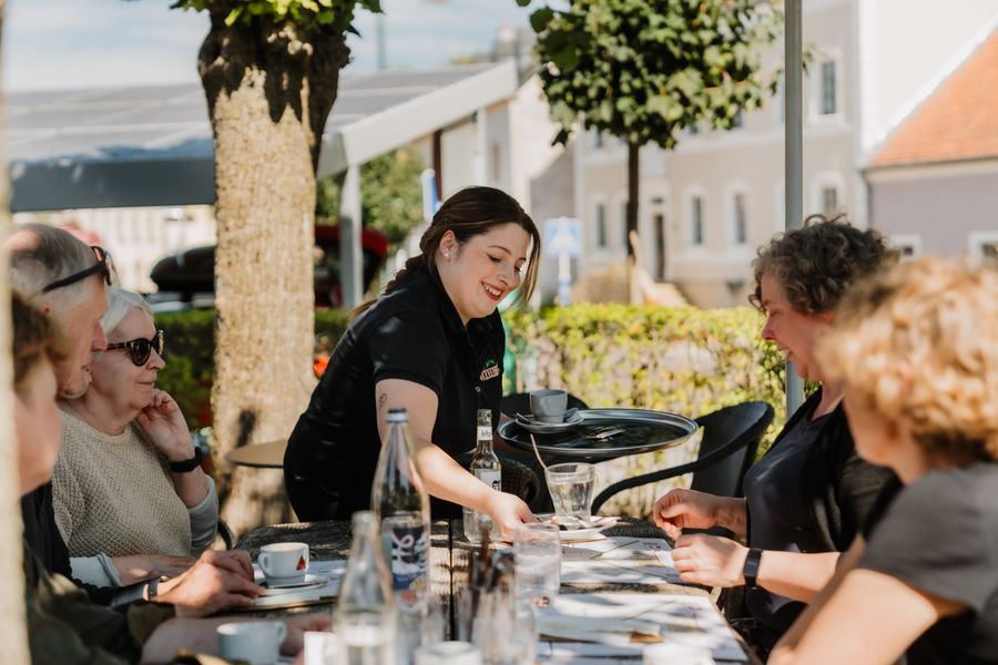 Biergarten ombragé en été, vente de vin chaud en hiver.