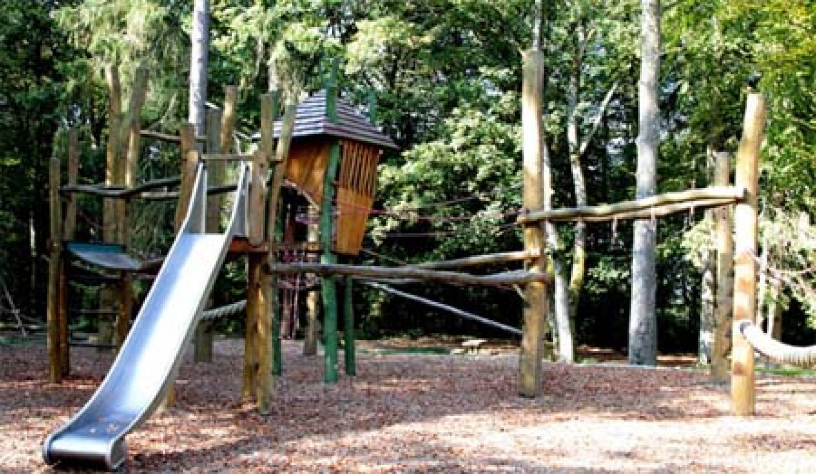 Grand terrain de jeux Martbusch. Aire de jeux ombragée en forêt pour petits et grands explorateurs.
