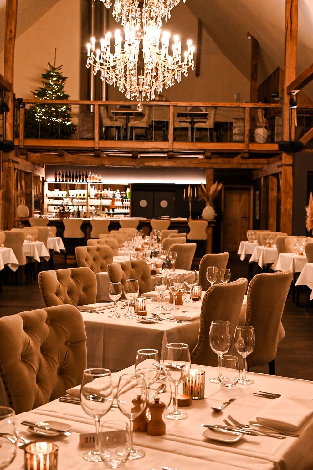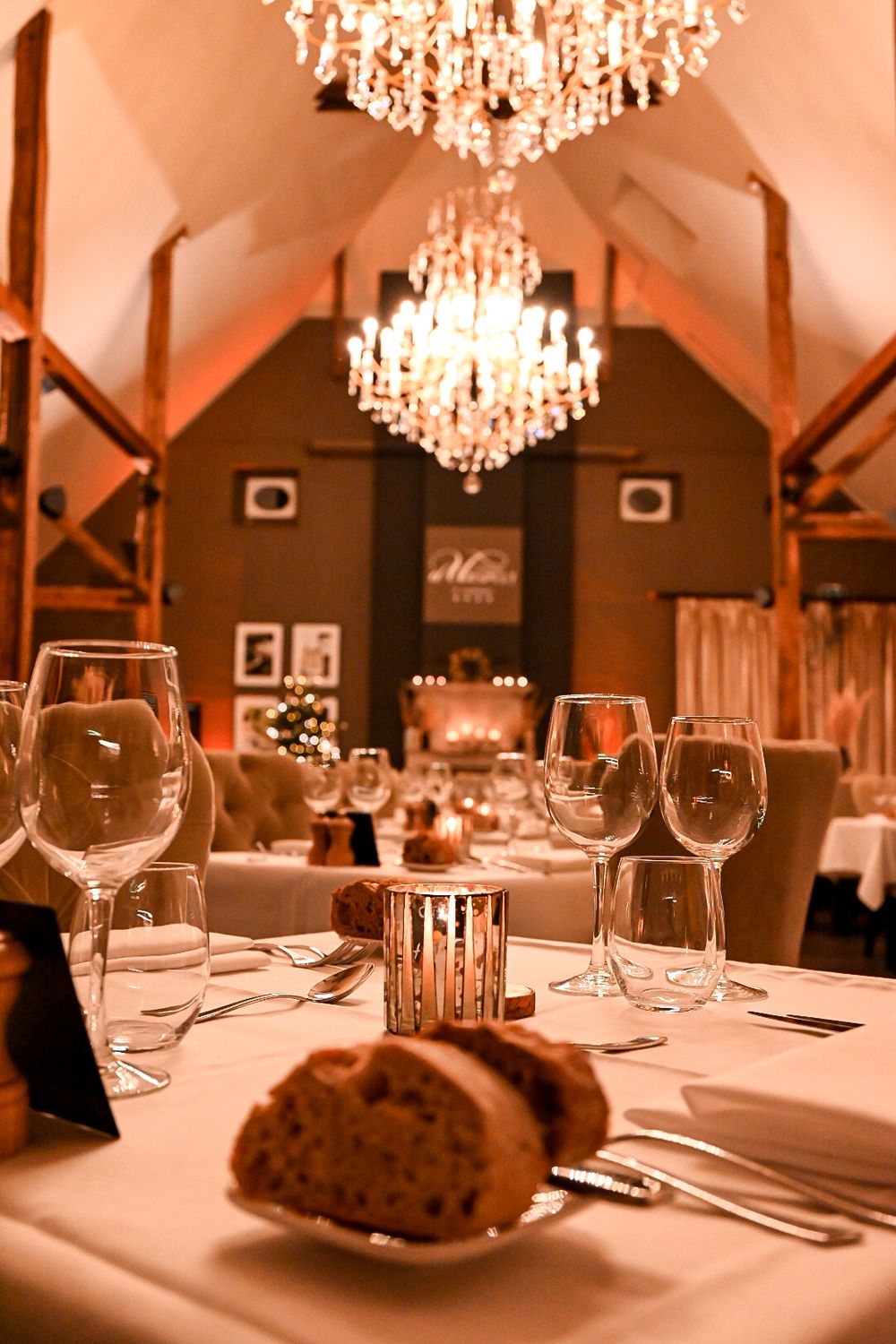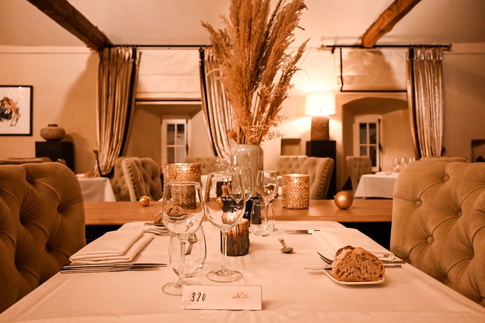 Elegant restaurant at Château d’Urspelt with fine dining and a terrace in the historic courtyard. Part of the hotel.