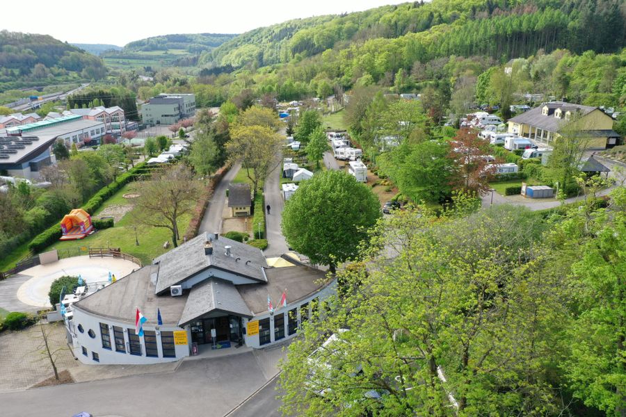 Centrum van 't land, op het kruispunt van de toeristische wegen en paden. Rustige ligging, zwembad. Speeltuin. Animatie voor kinderen. Restaurant met terras met uitzicht op het dal van Mersch, gratis Wifi. Verhuur van mobilhomes.