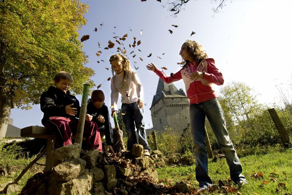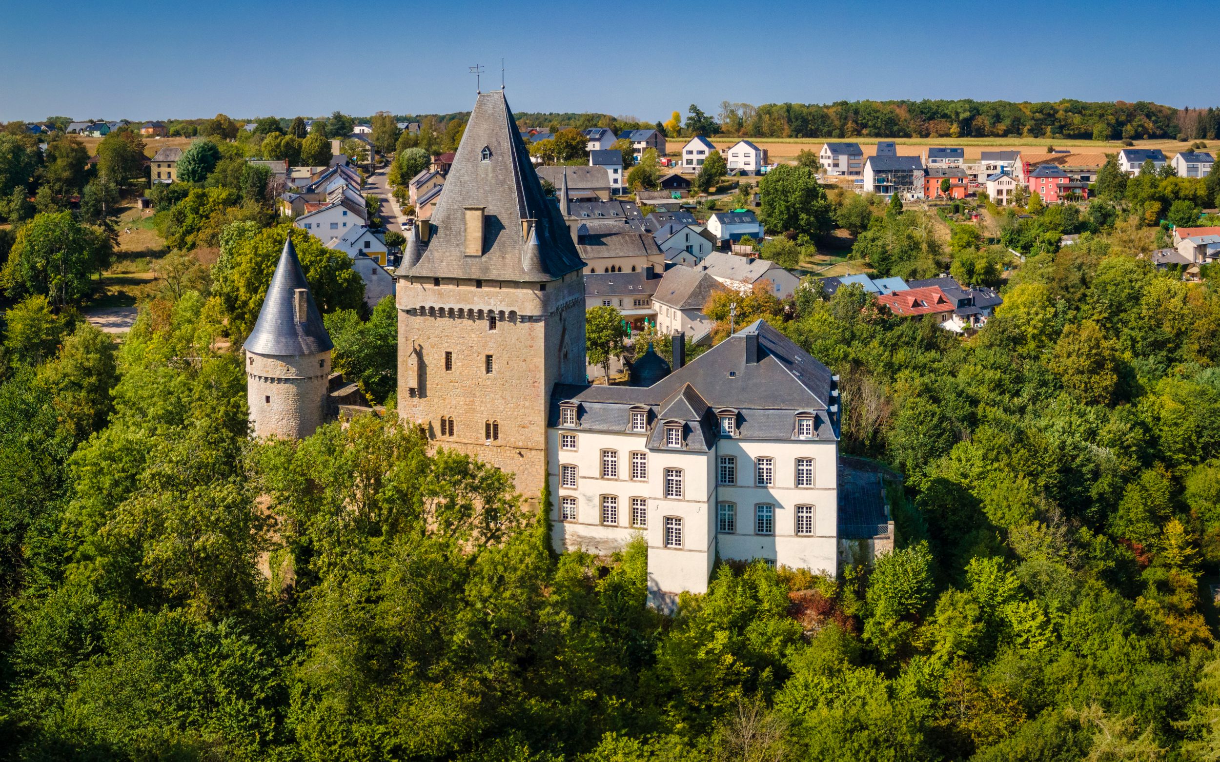 Oud riddergoed van Hollenfels met indrukwekkende burchttoren, nu omgebouwd in jeugdherberg en ecologisch centrum.