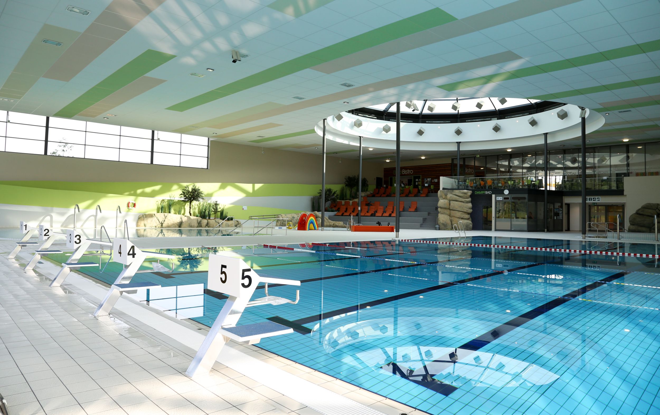 Het watercentrum biedt meer dan 3500 vierkante meter sport, recreatie en ontspan ning voor het hele gezin, hobbysporters en professionele zwemmers. Van een peuterbad tot een uniek saunalandschap met fitness- en gezondheidscentrum; alles is hier te vinden.