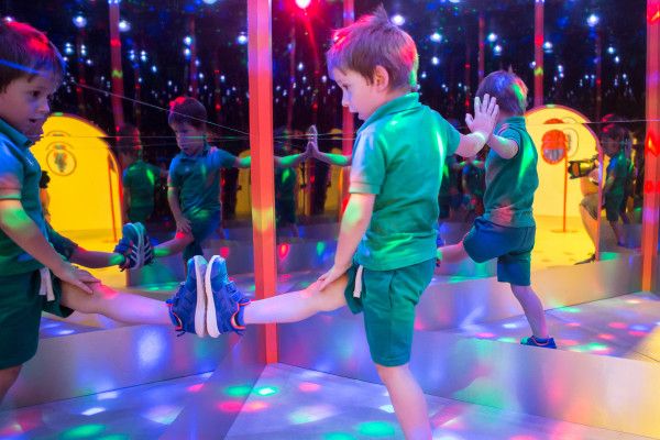 They can for instance test their scent by smelling something without seeing it, produce bright tones by hopping, jumping or even dancing, experience the mechanical advantage by using the pulley-exhibit and pulling themselves up to the ceiling, grasp the law of conservation of momentum and energy with the Newton pendulum, and even step inside a giant bubble.